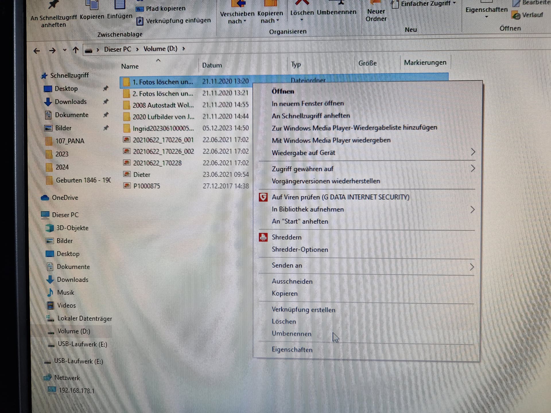 Schritt 1: Ordner auswählen, dessen Name geändert werden soll (siehe oben). Der Ordnername ist wieder blau unterlegt. Dann mit der rechten Maustaste wieder auf diesen Ordner klicken, es öffnet sich ein Fenster (siehe Foto):