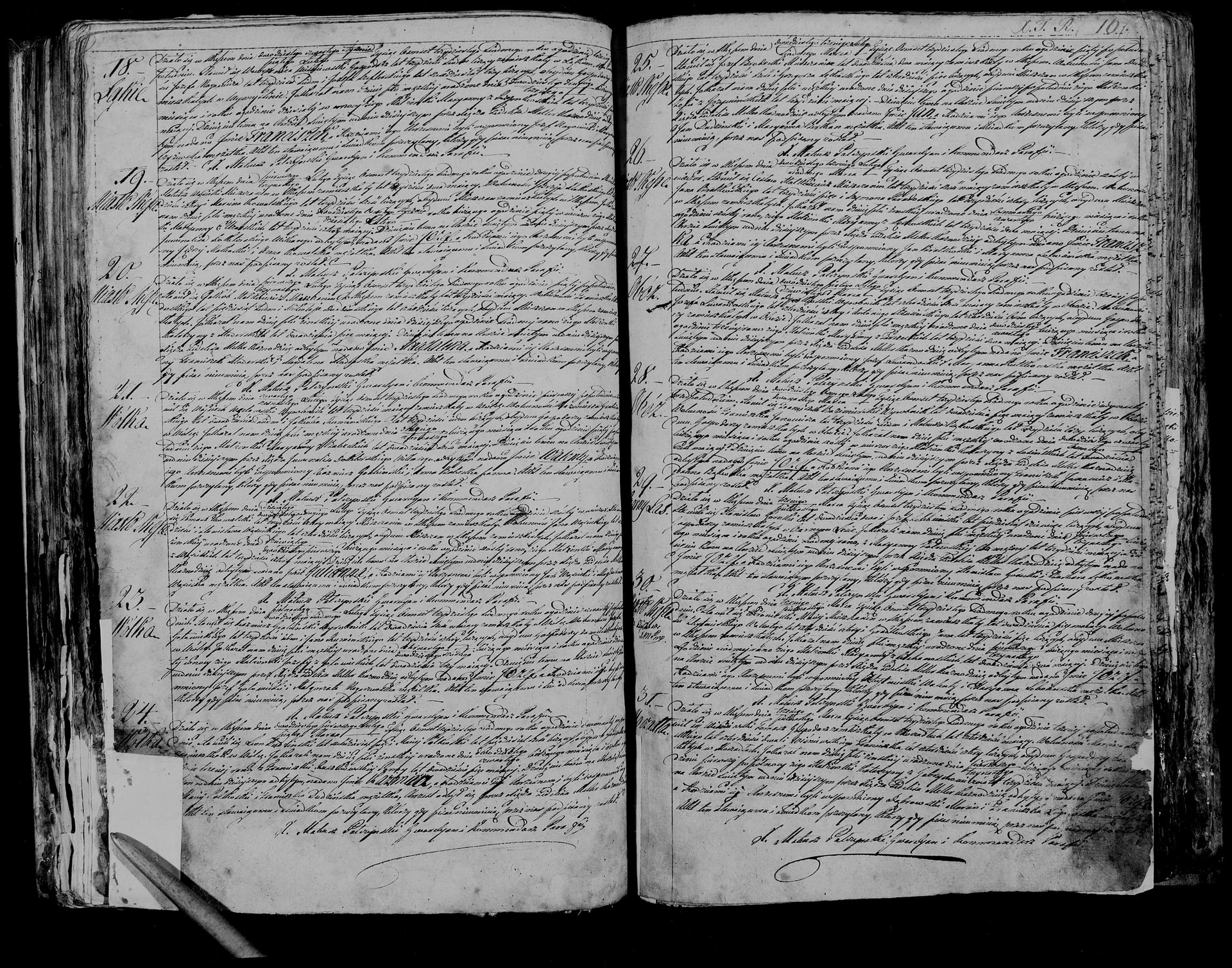 “Dziato się w Skępem dnia dwudziestego ósmego lutego/dwunastiego marca tysiąc osiemset trzydziestego siódmego roku o godzinie. Stawit się Franciszek Bazimierski wyrobnik lat dwadziescia pięć XXX XXX w Obózie. XXX (Die Zeugen?) Franciszekia Janumicza lat trzydziedu siedem i XXX XXX (Name zweiter Zeuge?) lat trzydziedu trzy, XXXXXXX w Obózie. XXXXXXXX dnia dwudziestego czwartego lutego XXX i roku XXX XXX w XXXXXXXX Katarzyny z Sosinskich lat dwadziescia dziewięć XXXXXXXX…”