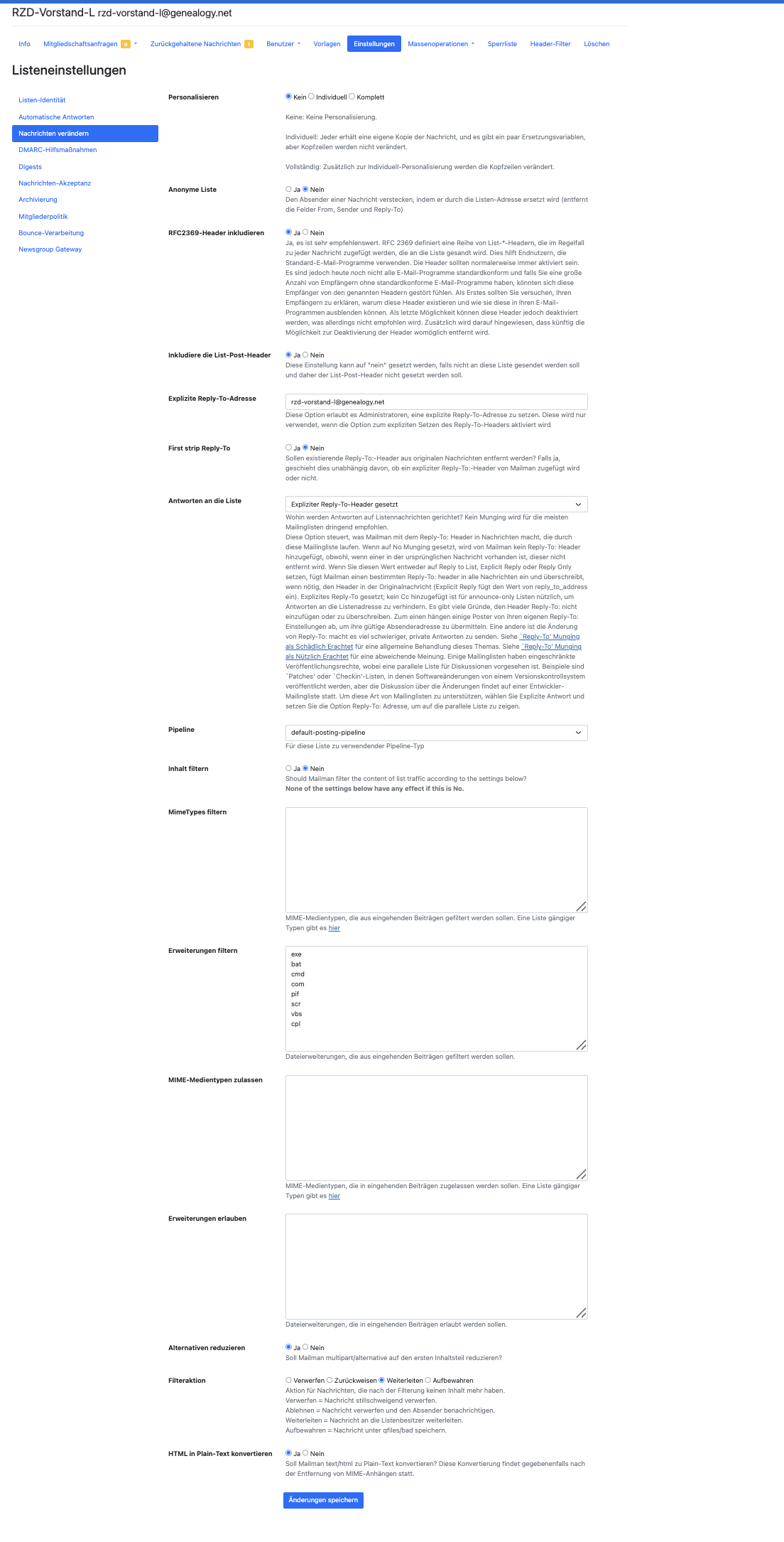 Können wir bitte die Einstellungen der CompGen-Mailingliste – bei der Heiko offenbar keine Probleme hat – mit denen der RzD-Vorstand-Mailingliste vergleichen? Als Ausgangspunkt habe ich einen Screenshot der Einstellungen für „Nachrichten verändern“ beigefügt.