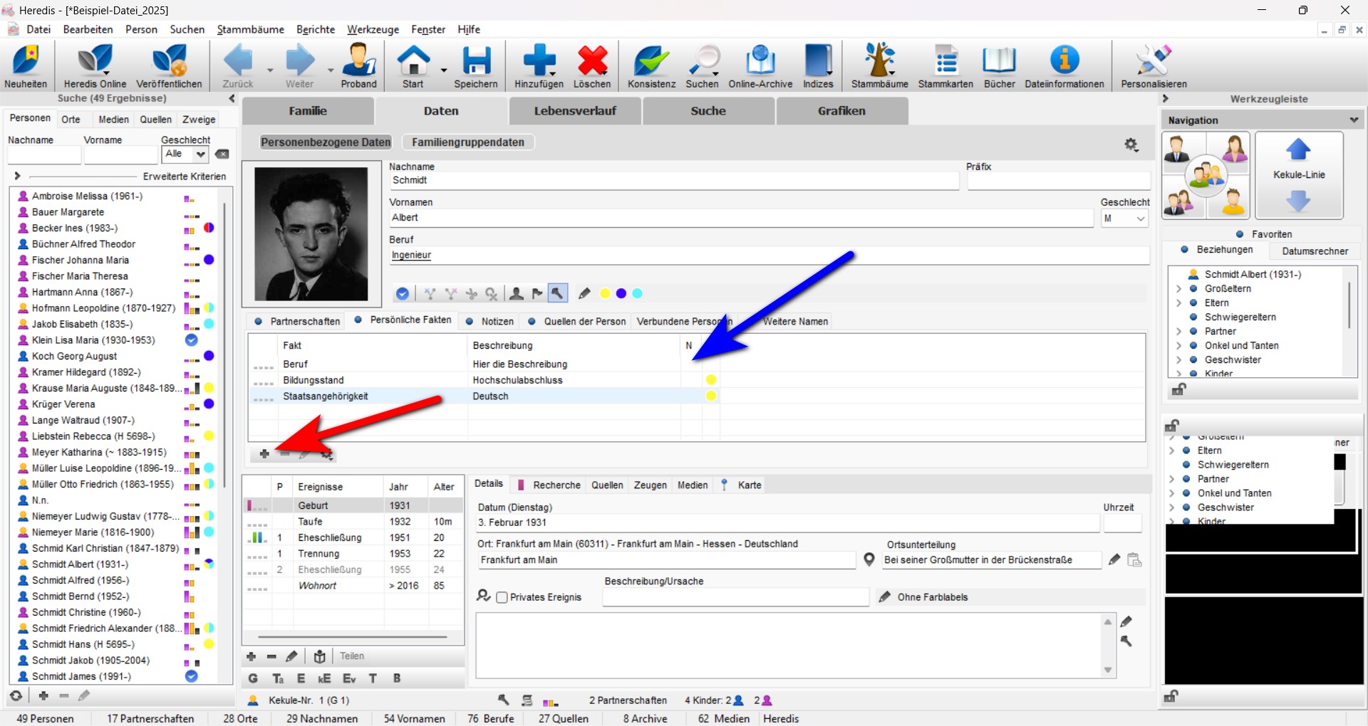 Hier kannst Du dich mit deinen Eingaben austoben. Das schöne ist: wenn Du hier ein Datum einträgst werden die persönlichen Fakten nach diesen Angaben sortiert. So sind so viele Berufe/Wohnorte/etc. möglich wie Du möchtest.