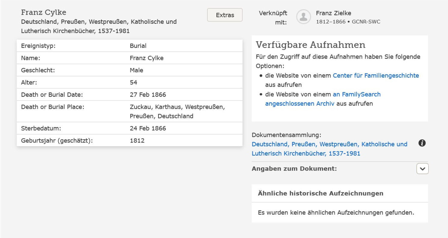 ich habe neue Informationen zu meinem Vorfahren Franz Zielke. Zwar kann man immer noch nicht in die Familenzentren der Mormonen, aber über die Index-Suche auf FamilySearch habe ich den Begräbniseintrag von Franz Zielke aus Zuckau, im Jahr 1866 gefunden. Der paßt jedenfalls dazu, daß seine Witwe Franziska geb. Kreft bzw. Krefft ein paar Monate später im Sommer den Constantin von Kruschinski geheiratet hat. Demnach kann mein Vorfahre dann doch nicht der Franz Zelca aus Seefeld geb. 1831 sein, der evtl. mit dir in Verbindung steht. Denn das Alter wird mit 54 Jahren angegeben. Das wäre in etwa ein Geburtsjahr um 1812. Es könnte passen zu einem Paulus Franciscus Cylka geboren am 26.01.1812 in Lniska(?) bei Zuckau mit den Eltern Jacob Cylka und Eva Dombrowska.