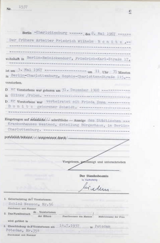 Bei einer Suche in der Sammlung „Berlin, Deutschland, Sterberegister, 1874-1986“ stieß ich auf den Friedrich Wilhelm Bonitz, geboren 1900 in Glinke (heute in Polen), gestorben 1968 in Berlin.