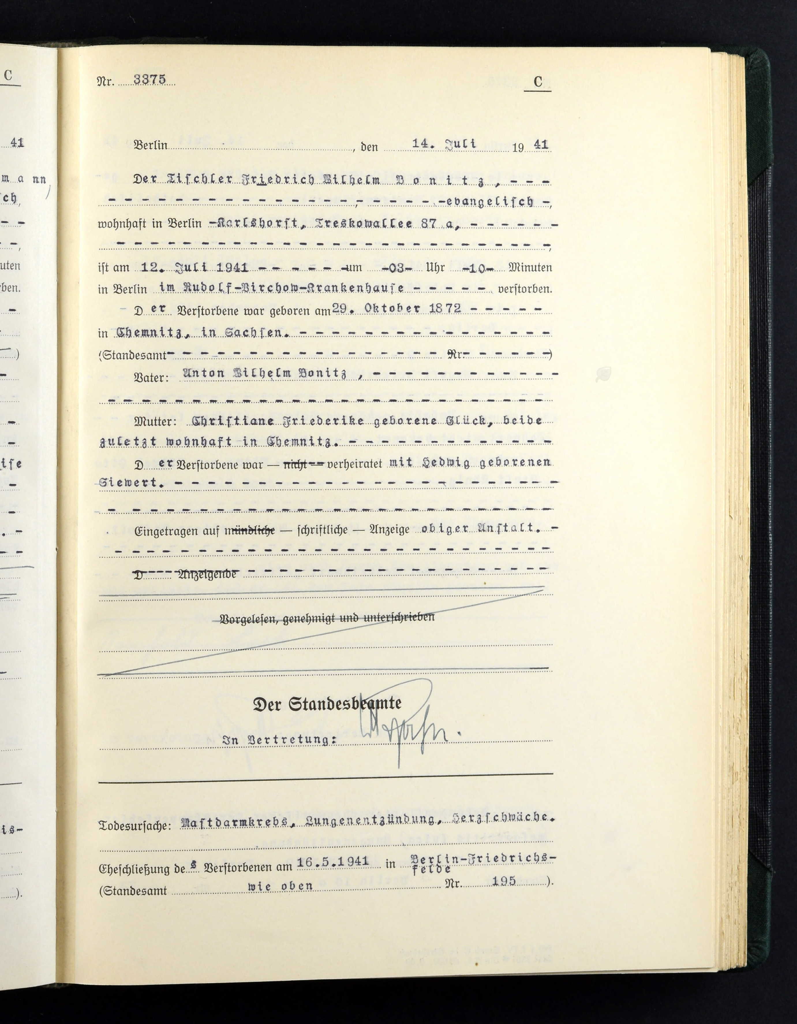 vielen Dank für diese zwei Urkunden. Das sind sehr hilfreiche Ergänzungen zu meiner Forschung. Interessant ist, dass der Friedrich Wilhelm Bonitz, der 1941 in Berlin verstarb, 2 Monate vor seinem Tod noch einmal geheiratet hat. Seine erste Eheschließung war bereits 1895, geschieden 1922.