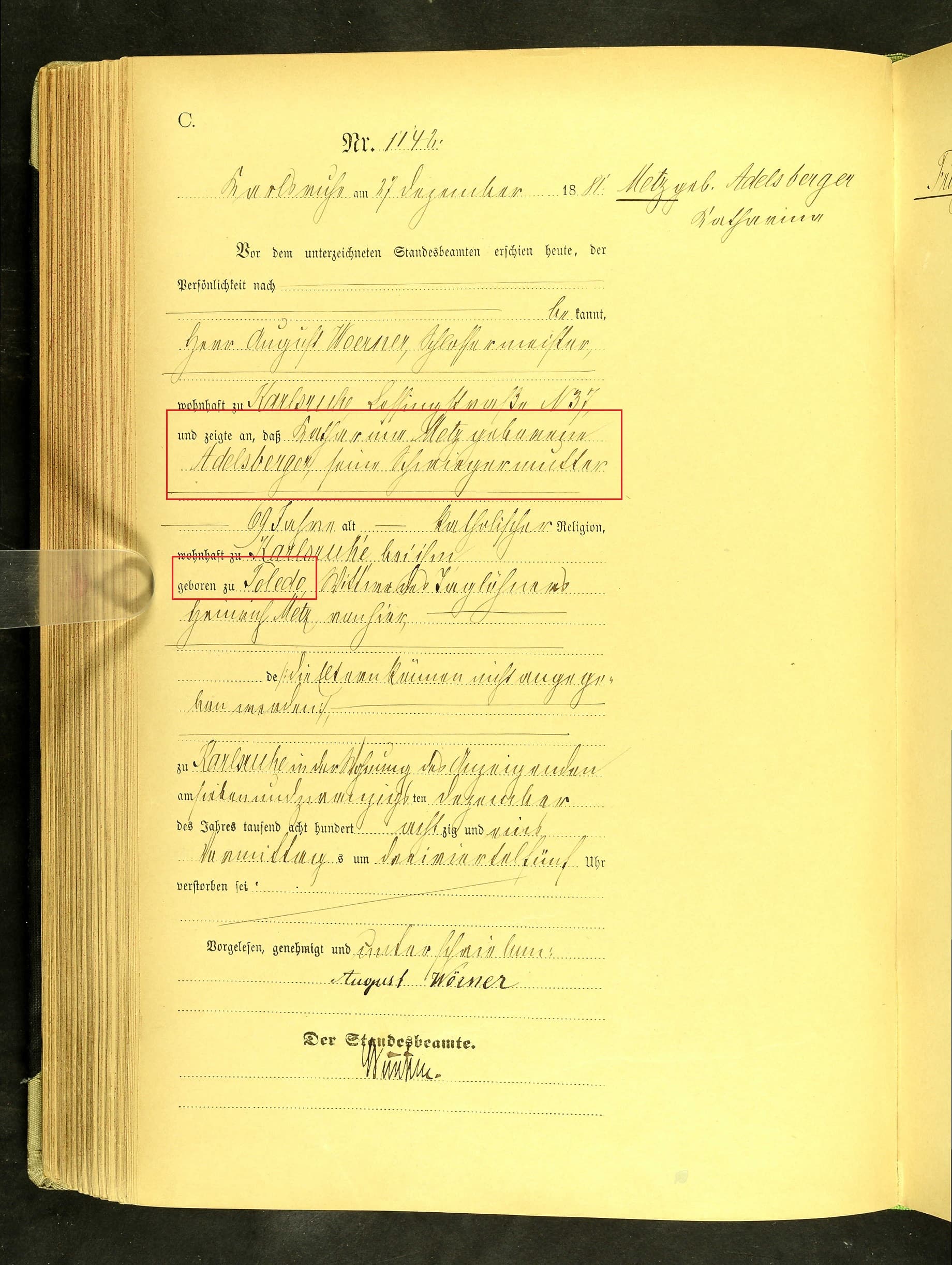 Jetzt das seltsame: 1881 wird bei ihrer Todesanzeige in Karlsruhe geschrieben, daß sie in TOLEDO geboren wäre.