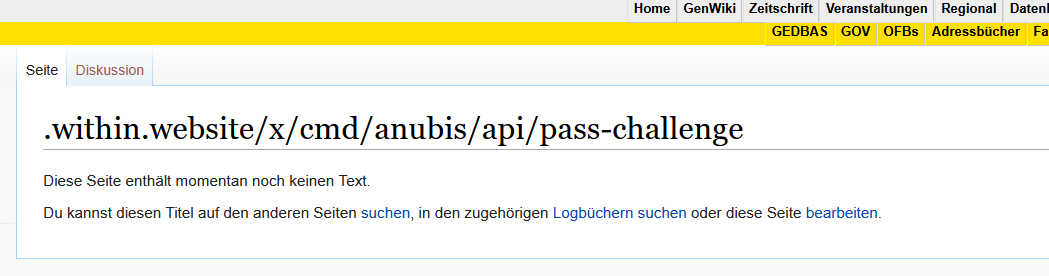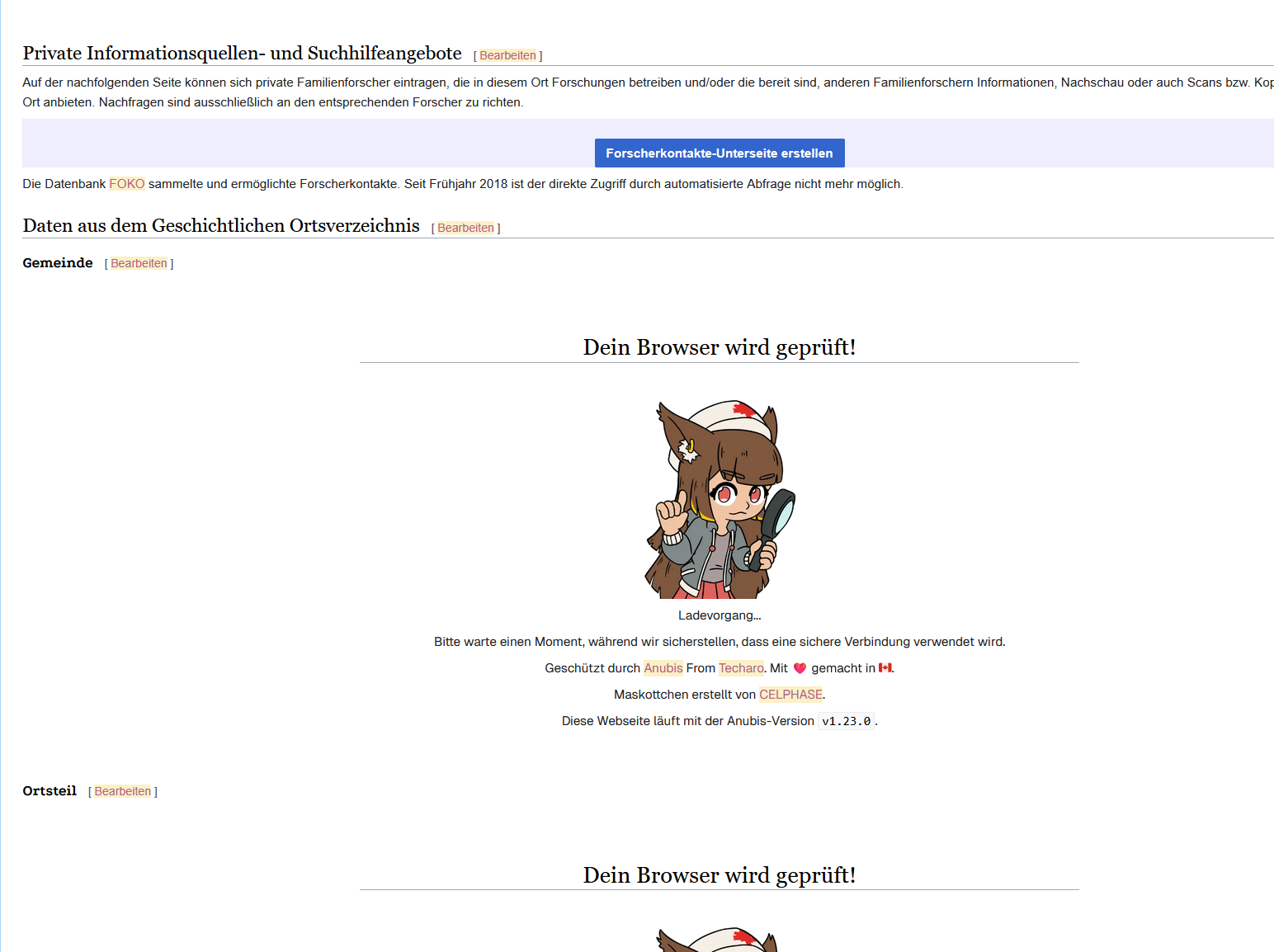 Bisher hatte ich das Thema nicht ganz ernst genommen. Angesichts der Rückmeldungen habe ich jetzt aber ein Ticket anubis und Design (#79) · Issues · genwiki / GenWiki · GitLab aufgemacht. Bei mir wird die Seite St. Märgen – GenWiki z.B. gar nicht angezeigt sondern es erscheint ein Nebeneffekt einer Fehlkonfiguration von Anubis.