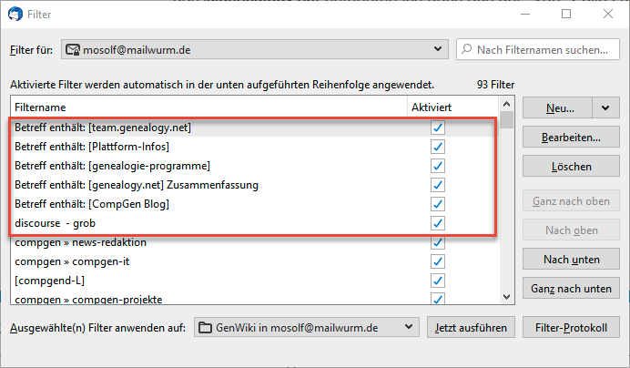Liebe Nutzer von E-Mail Programmen, die Ihr Filter nutzt. Ich habe mir für die Nutzung von discourse einen Filter eingerichtet, den ich „discourse - grob“ genannt habe. Unterhalb des Posteingangs habe ich mir einen Ordner „discourse“ angelegt. In diesen Ordner verschiebe ich alle Mails, die von discourse kommen.