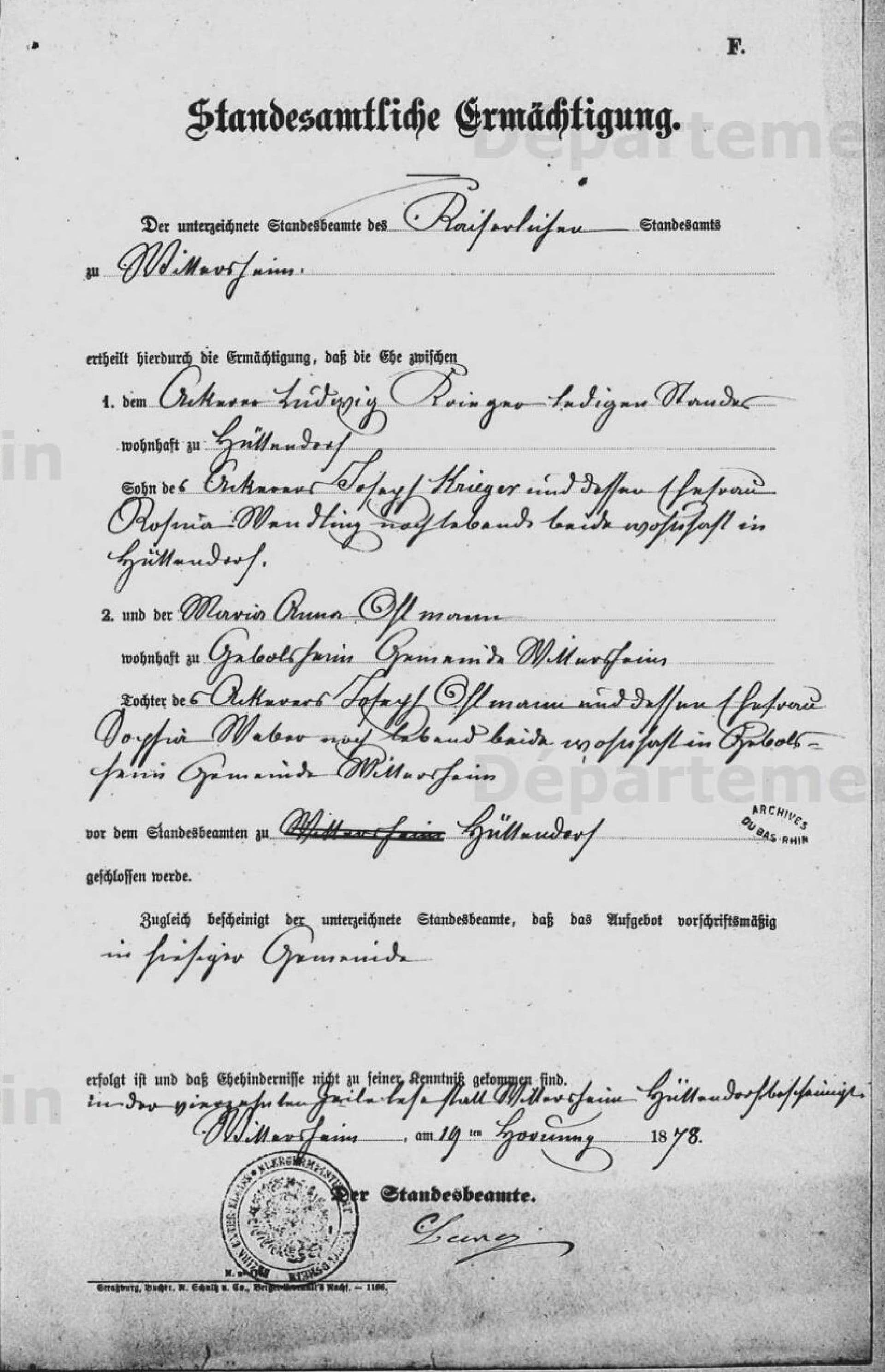 ich habe wieder einmal eine Urkunde, bei der ich die Ortsnamen nicht genau entziffern kann. Die Urkunde steht im Bezug zu Elsass Lothringen. Es handelt sich um eine Standesamtliche Ermächtigung.