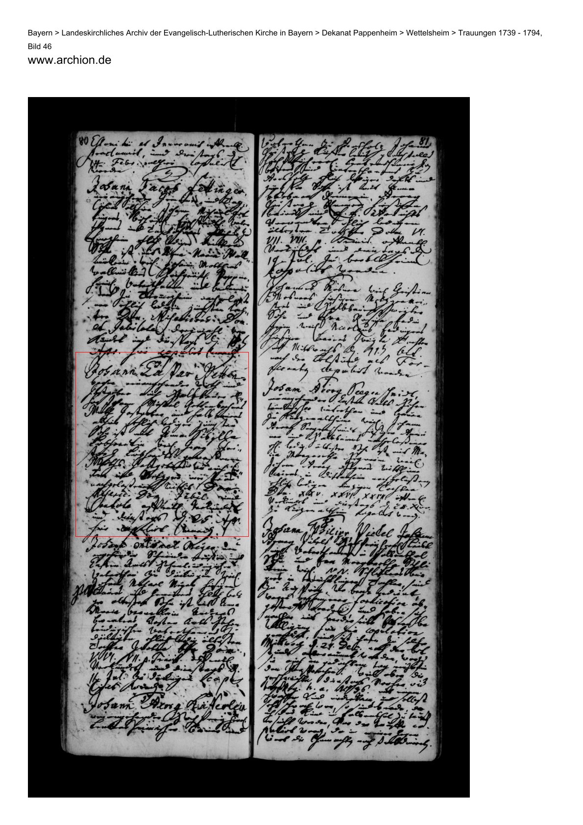 Liebe Forenmitglieder ich brauche Unterstützung bei einem Trauungseintrag von 1769. Der erste Teil ging, zum Ende zu komme ich bei einem Teil nicht weiter. Es geht um den rot umrandeten Bereich des Dokuments. Der Permalink zu Archion ist Viewer: Kirchenbücher online mit ARCHION