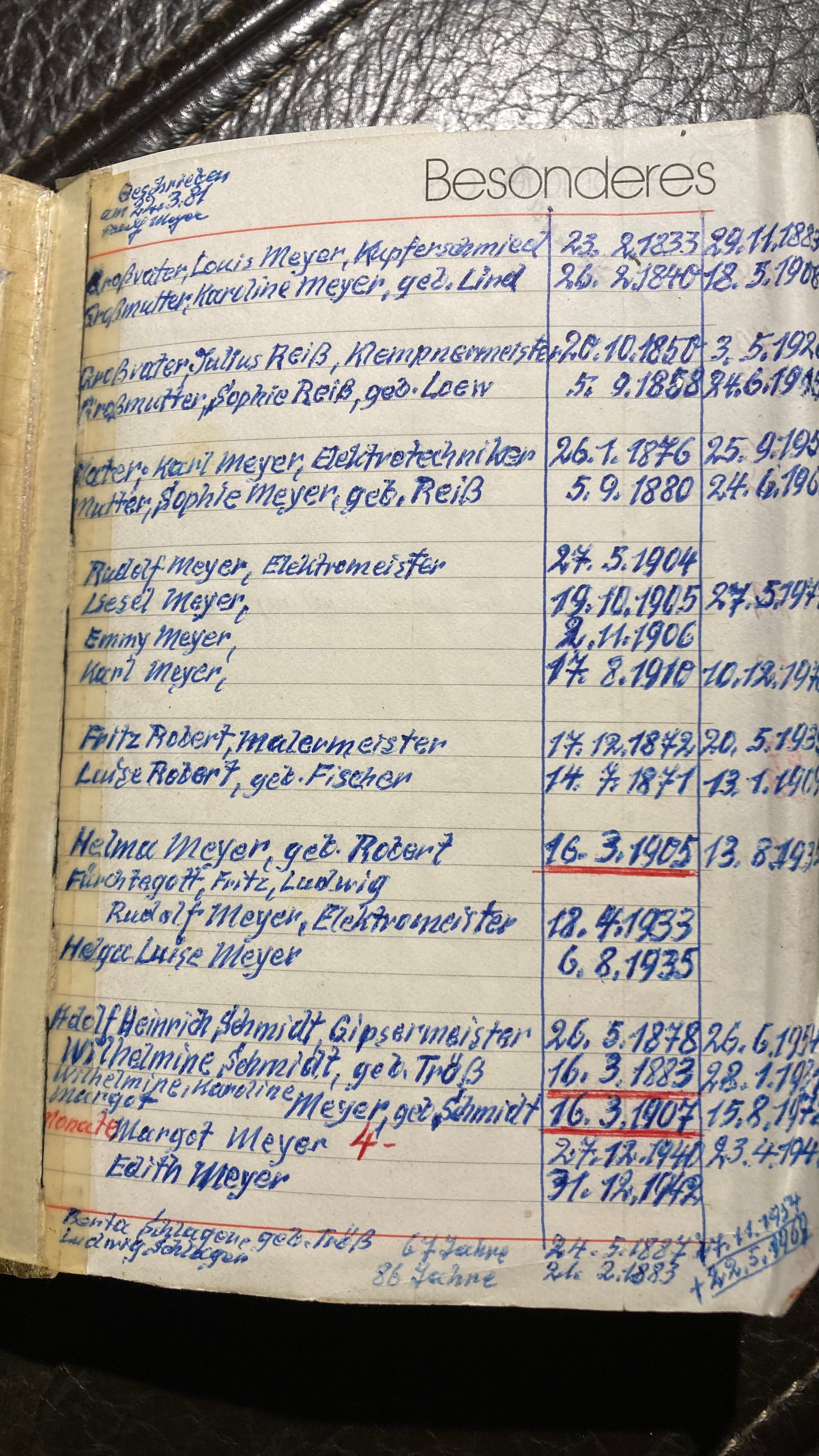 Aus einer handschriftlichen Aufzeichnung meines Großvaters entnehme ich, dass ihre Eltern der Malermeister Fritz Robert (*17.12.1872 † 20.05.1939) und seine Frau Luise, geb. Fischer (*14.07.1871 † 13.01.1909) waren.