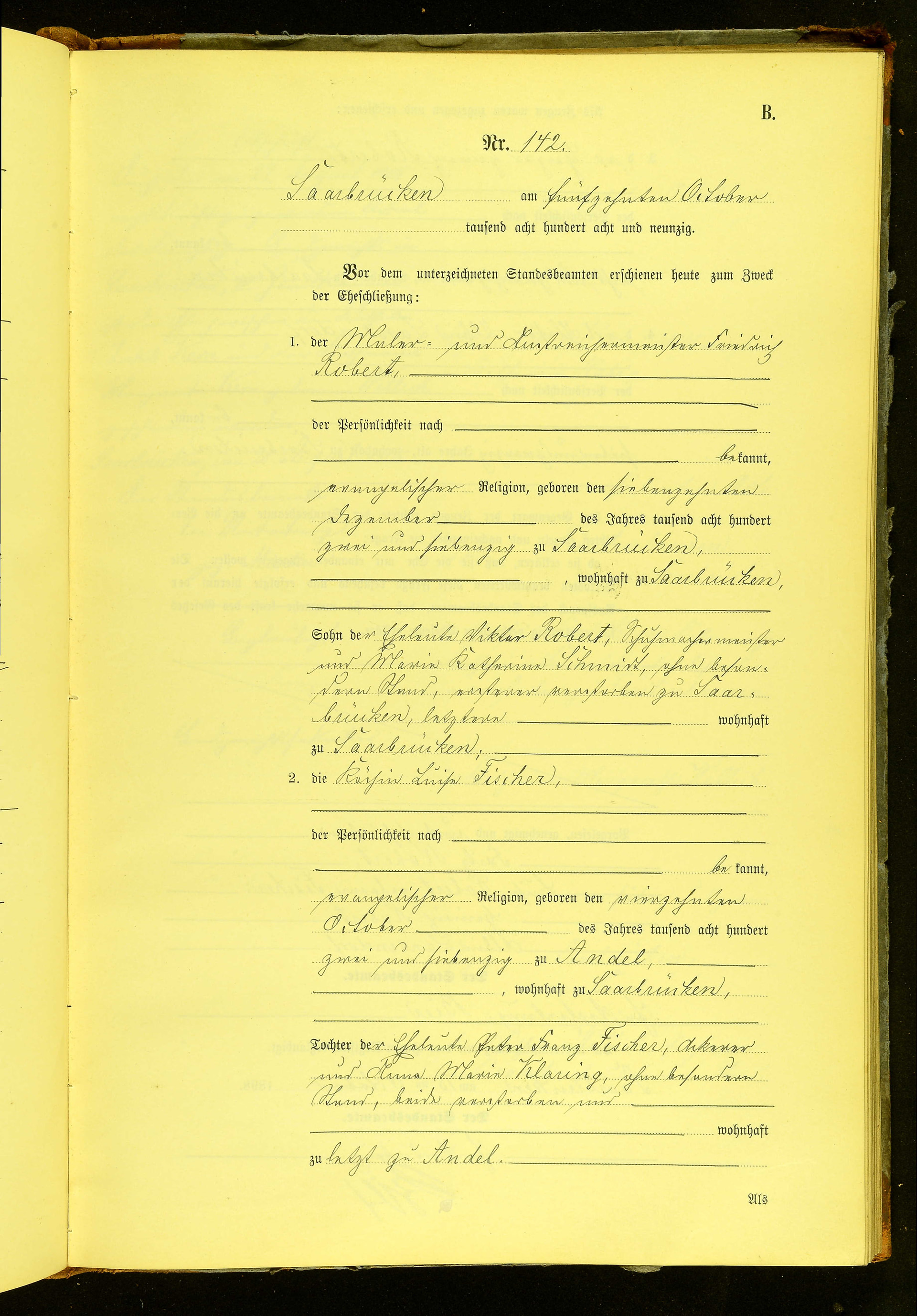 Diese Heiratsurkunde verzeichnet Luise Fischer als geboren zu Andel sowie als Tochter von Peter Franz Fischer und seiner Frau Anna Maria, geb. Klaring.