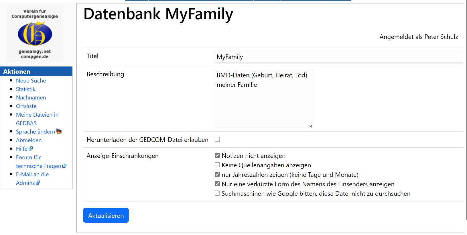 Bei mir gibt es die gezeigten Optionen „Anzeige-Einschränkungen“ nicht (Upload per API aus Ahnenblatt).