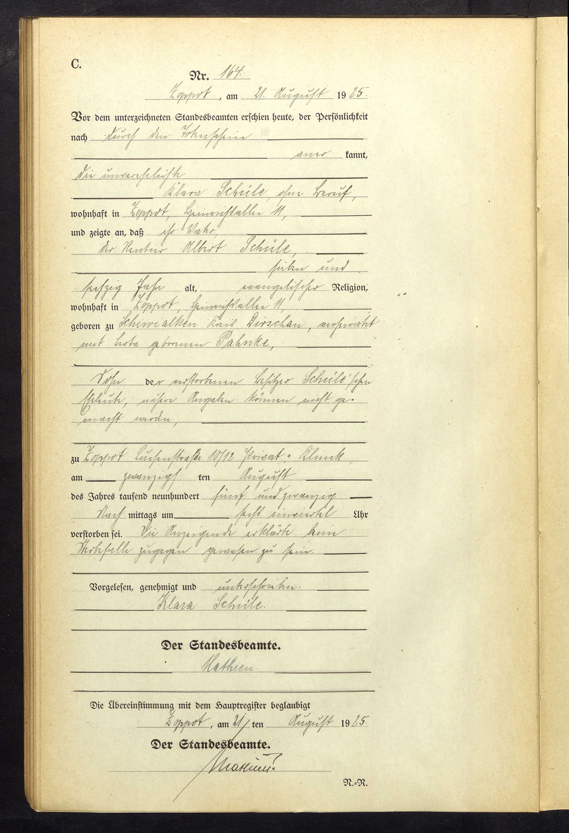 Friedrich Albert Schüle (* Schiwialken 26.03.1854, ^ Sobbowitz EK 02.04.1854, + Zoppot, Privatklinik 20.08.1925)