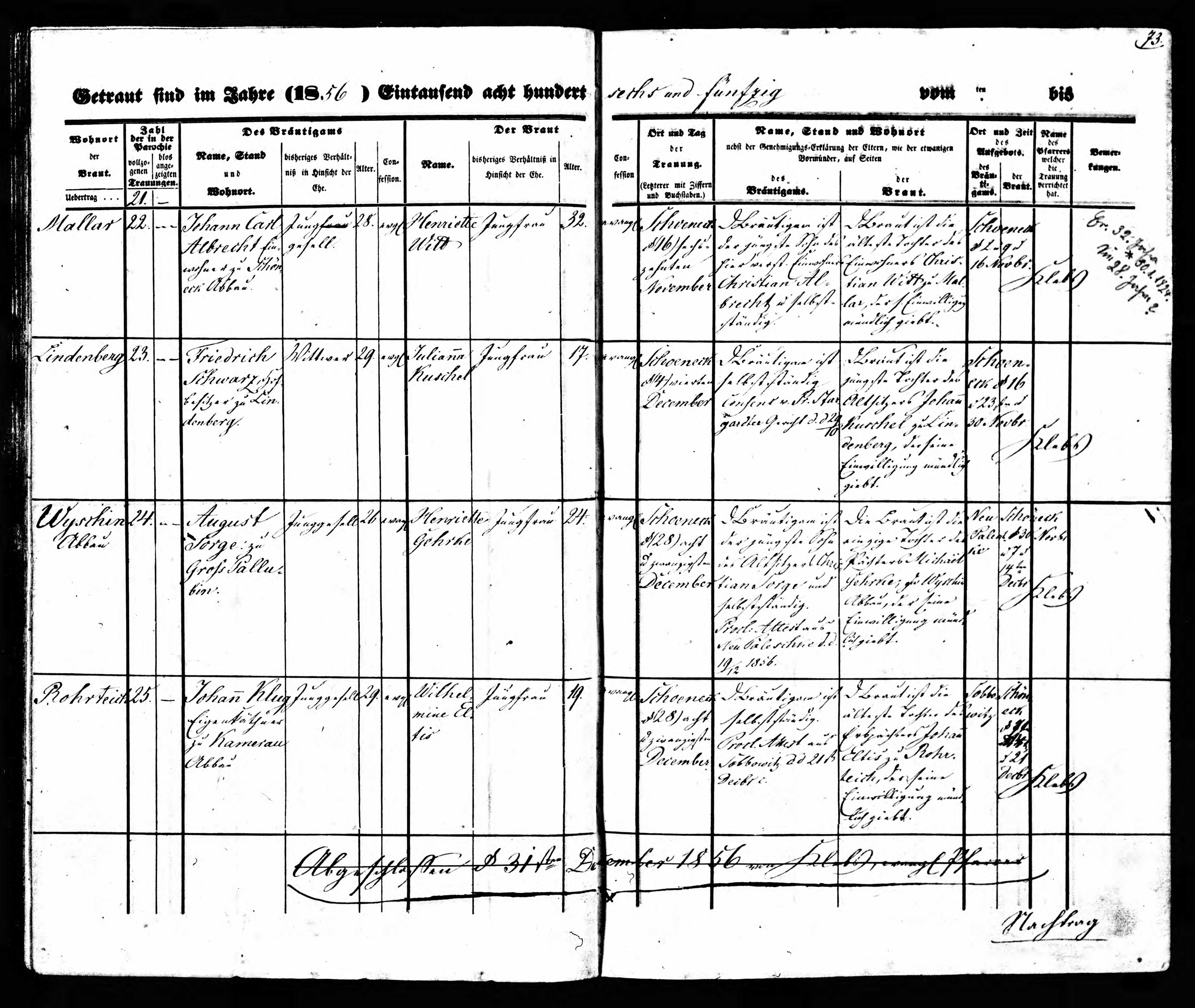 Ehe Nr. 1: 04.12.1856 ev Schöneck-Land Friedrich Schwarz, Hofbesitzer zu Lindenberg, sie 17