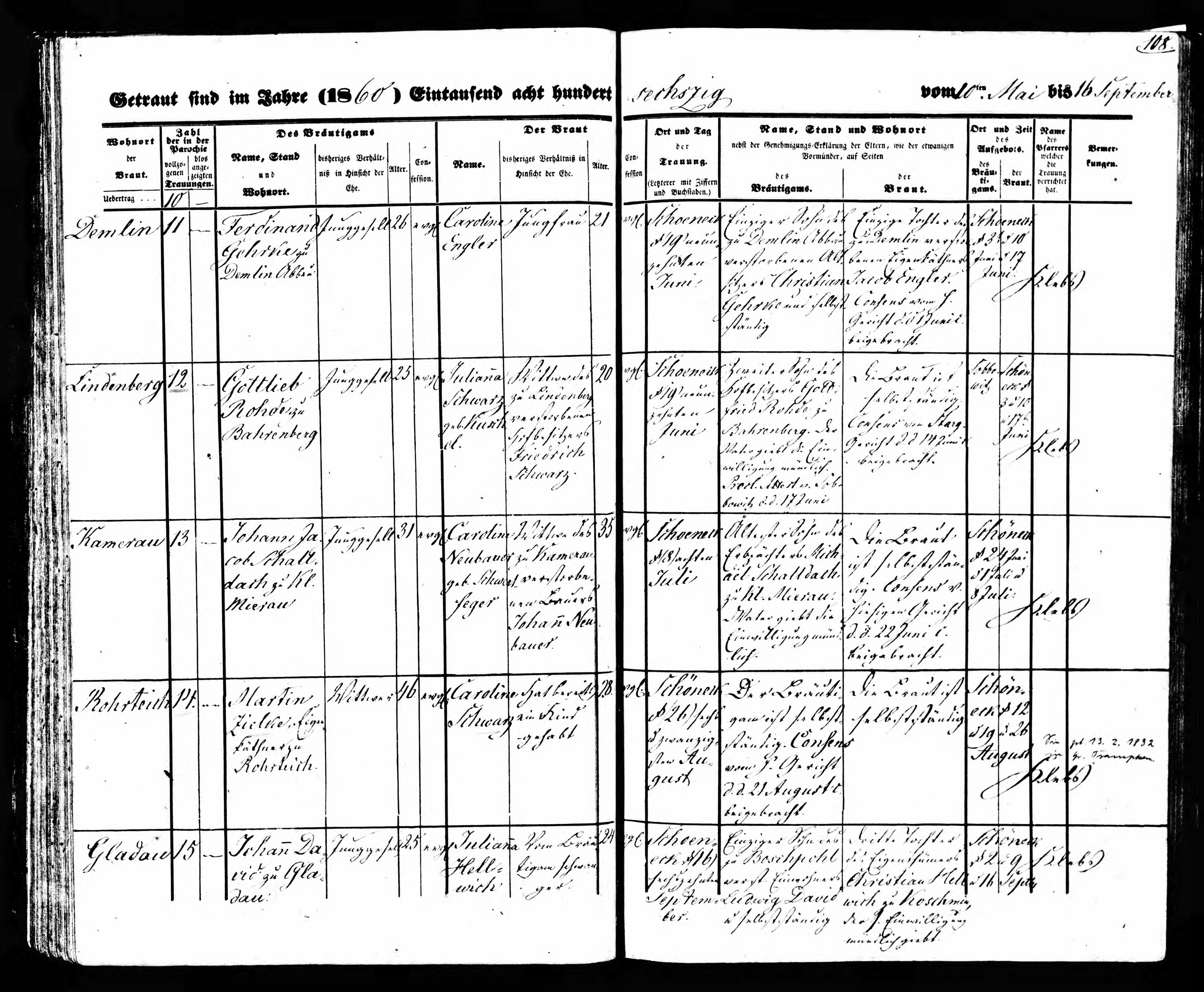 Ehe Nr. 2: 19.06.1860, ev Schoeneck-Land, Gottlieb Rohde zu Bahrenberg