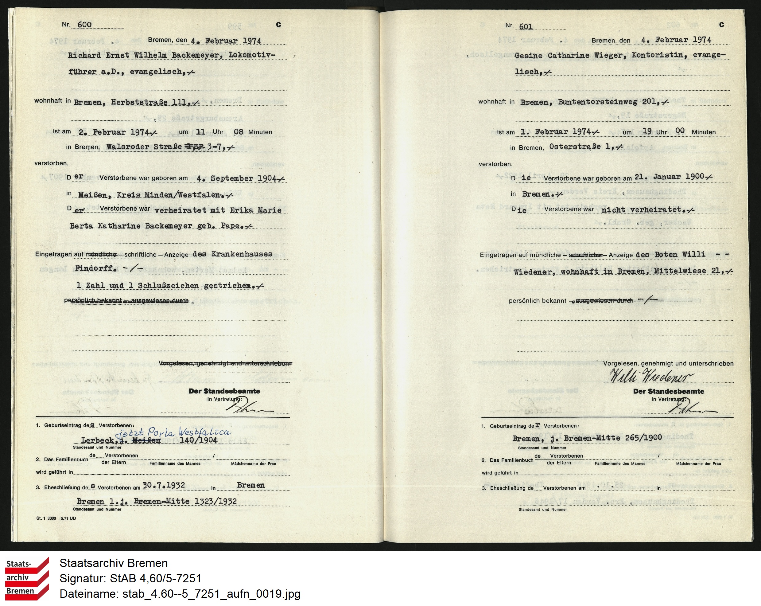 Obwohl ich die Sterberegister in Bremen durchgeschaut habe, habe ich den gesuchten Eintrag von Käthe Wieger geb. 21.1.1900 verst. 1.2.1974 nicht finden.