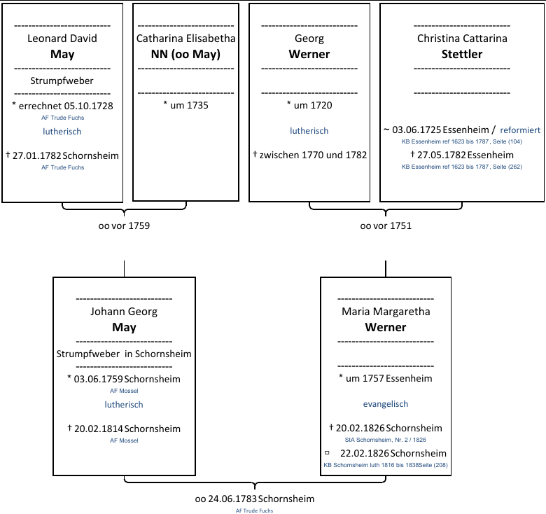 Hilfreich könnte ggf. der Heiratseintrag von Maria Margaretha & Joh. Georg May am 24.06.1783 in Schornsheim sein. Leider starten die Kirchenbücher von Schornsheim erst im Jahr 1814 bei Archion.