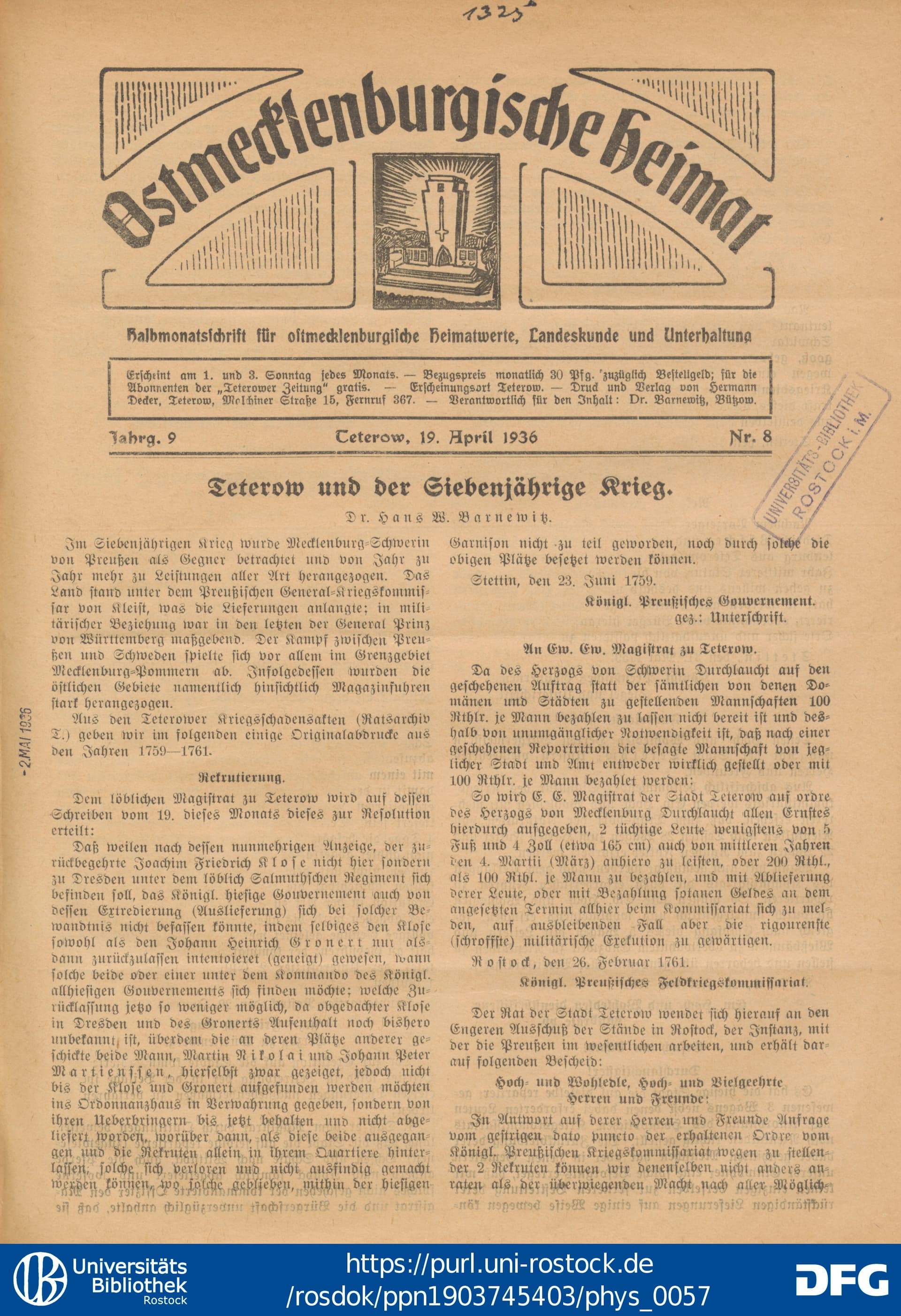 Ostmecklenburgische Heimat : Monatsschrift für ostmecklenburgische Heimatwerte, Landeskunde und Unterhaltung Jahrg. 9 (1936) Teterow : Druck und Verlag von Hermann Decker , 1936