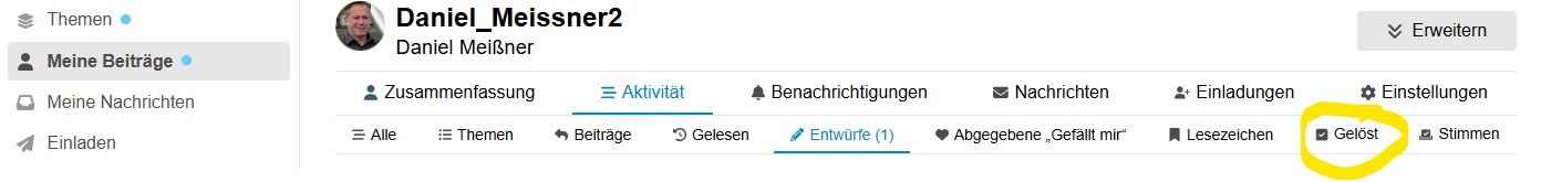Hi Flo, das geht natürlich auch. Ich hoffe aber tatsächlich auf eine systemische Lösung, welche dann auch die Suchfunktionalität unter „meine Beiträge“ bedient.