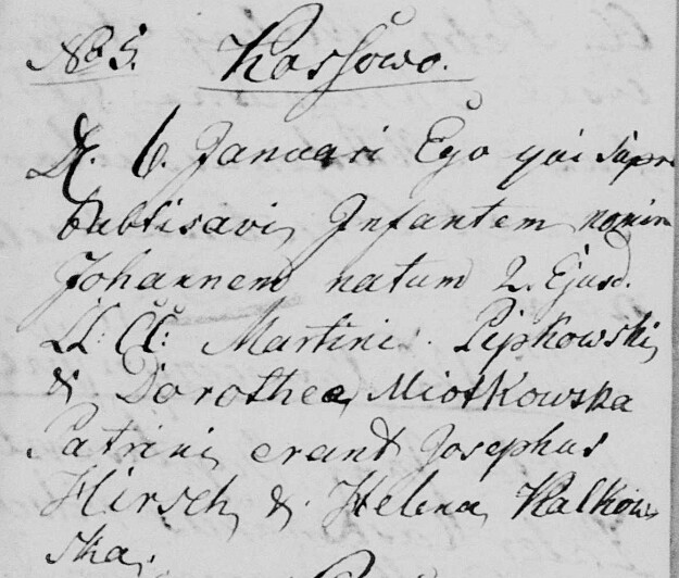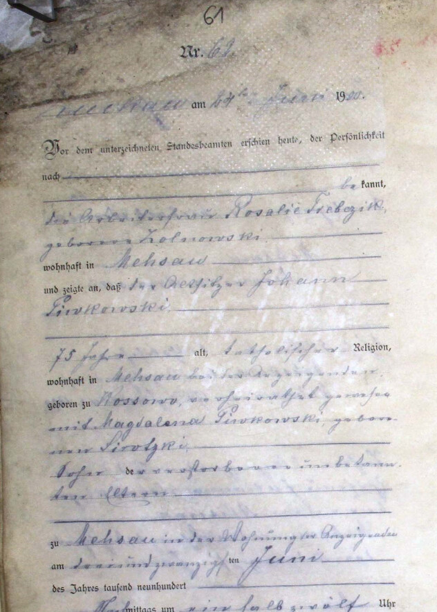 Den Tod des Johann habe ich, glaube ich, auch gefunden. Der ist 1900 in Mehsau bei Zuckau gestorben, aber die Frau aus der Familie Trebczik, bei der er gewohnt hat, hat anscheinend den Vornamen der Helena falsch als Magdalena angegeben. Die Sirotzkis waren zu der Zeit ja bereits aus Mehsau weg Richtung Rheinfeld und später Saspe gezogen. Als Geburtsort des Johann ist Kossowo und Alter 75 Jahre angegeben.
